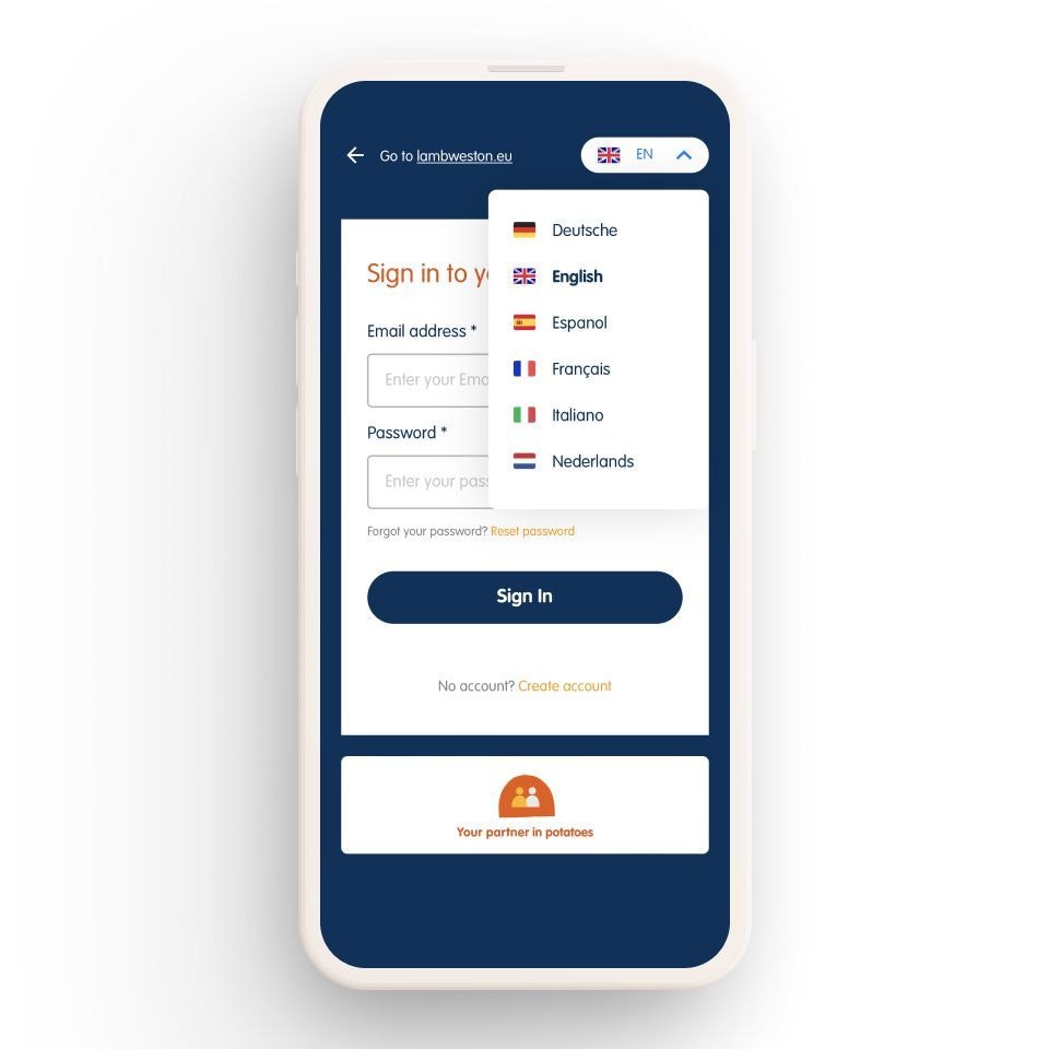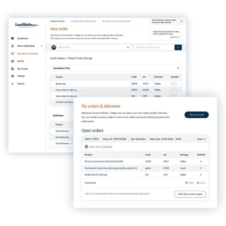 Together with Lamb Weston, we developed a digital customer portal, a personalized and secure platform integrated into the corporate website. This platform centralizes and automates the ordering process, enabling structured and immediate order processing, saving time, reducing errors, and strengthening customer relationships. Through the portal, purchasing organizations, wholesalers, and other customers can not only place orders directly but also gain insight into their invoices and personal data history. Furthermore, the platform offers direct access to Customer Care, shifting the focus from order processing to service and advice, an important part of Lamb Weston’s promise as ‘Your Partner in Potatoes.’ Customers can now do business faster and more easily, exactly as Lamb Weston envisions: as a partner who always thinks along and participates actively.