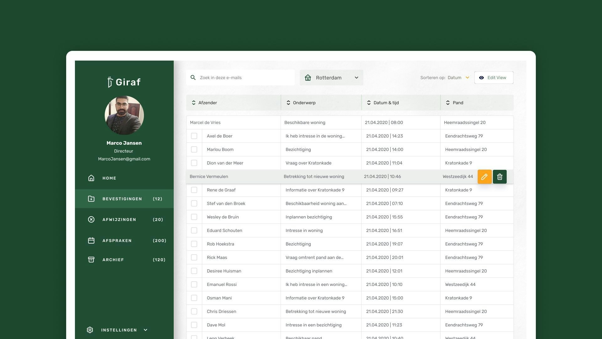 Ontmoet onze artificial intelligence mail-assistent: Giraf. Giraf is de door AI gestuurde oplossing, die partijen in de vastgoed- en verhuurbranche ondersteunt met het beantwoorden van de dagelijkse lading e-mails. Niet als apart programma, maar als een echte, eigen assistent in de vorm van een AI powered plugin, die het grootste deel van de mails kan lezen én ze kan voorzien van een passend antwoord. Zo verlaagt het de druk op medewerkers en houden zij meer tijd over voor de leuke zaken, zoals persoonlijke aandacht voor klanten en het doen van bezichtigingen. Dat overzicht in je mailbox zorgt dus direct voor extra energie!